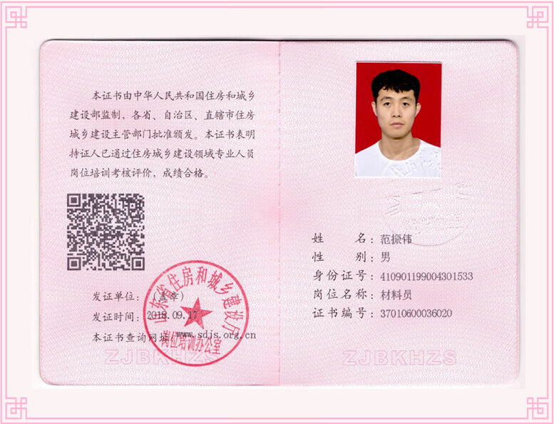 住房和城乡建设行业岗位证书-材料员证书-范振伟