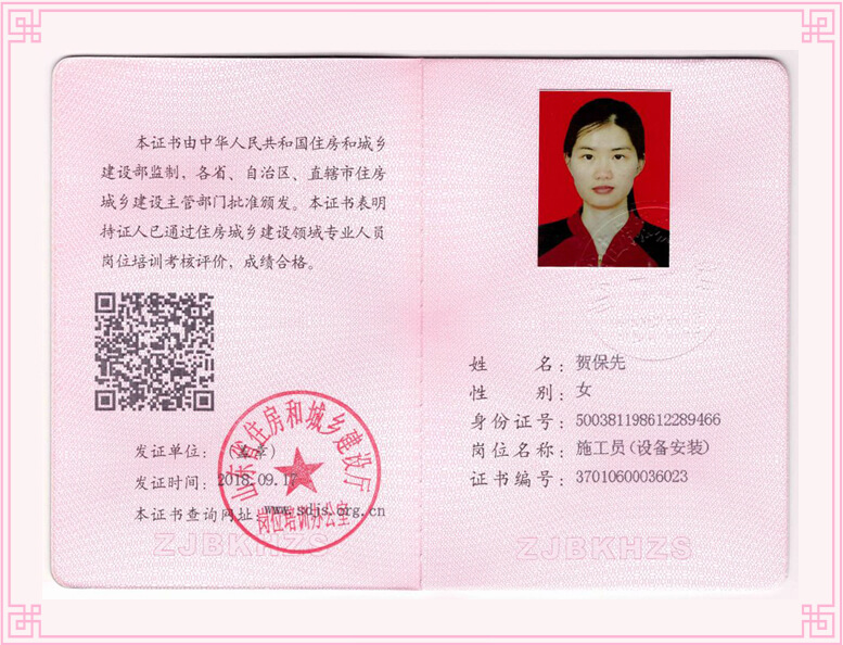 住房和城乡建设行业岗位证书-施工员(设备安装)证书-贺保先
