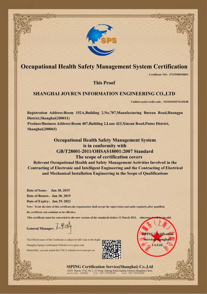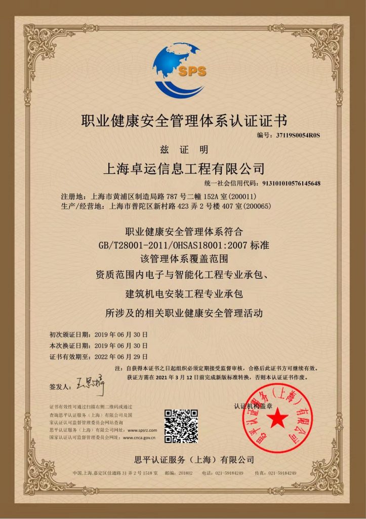 职业健康安全管理体系认证证书
