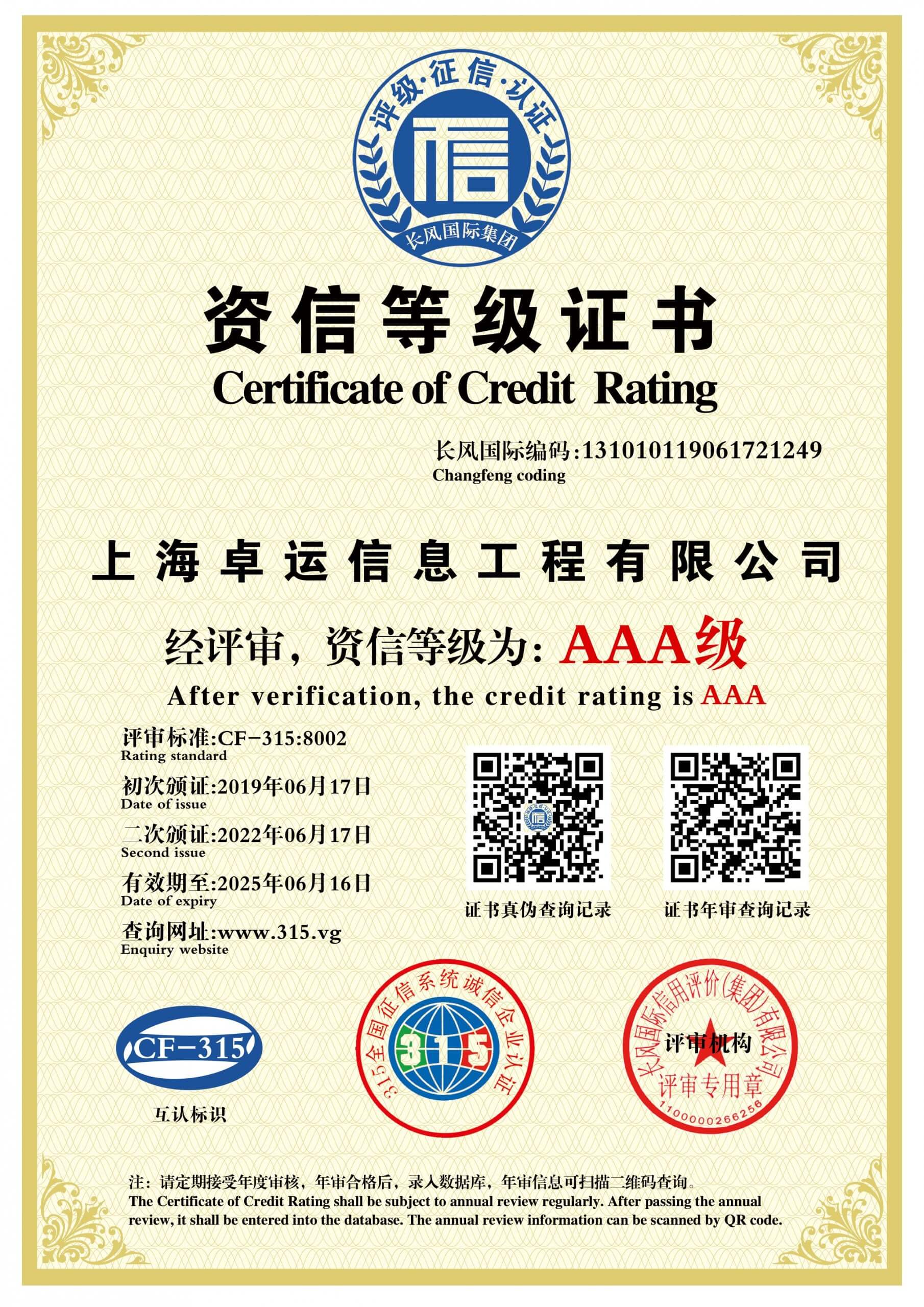 3A级资信等级证书