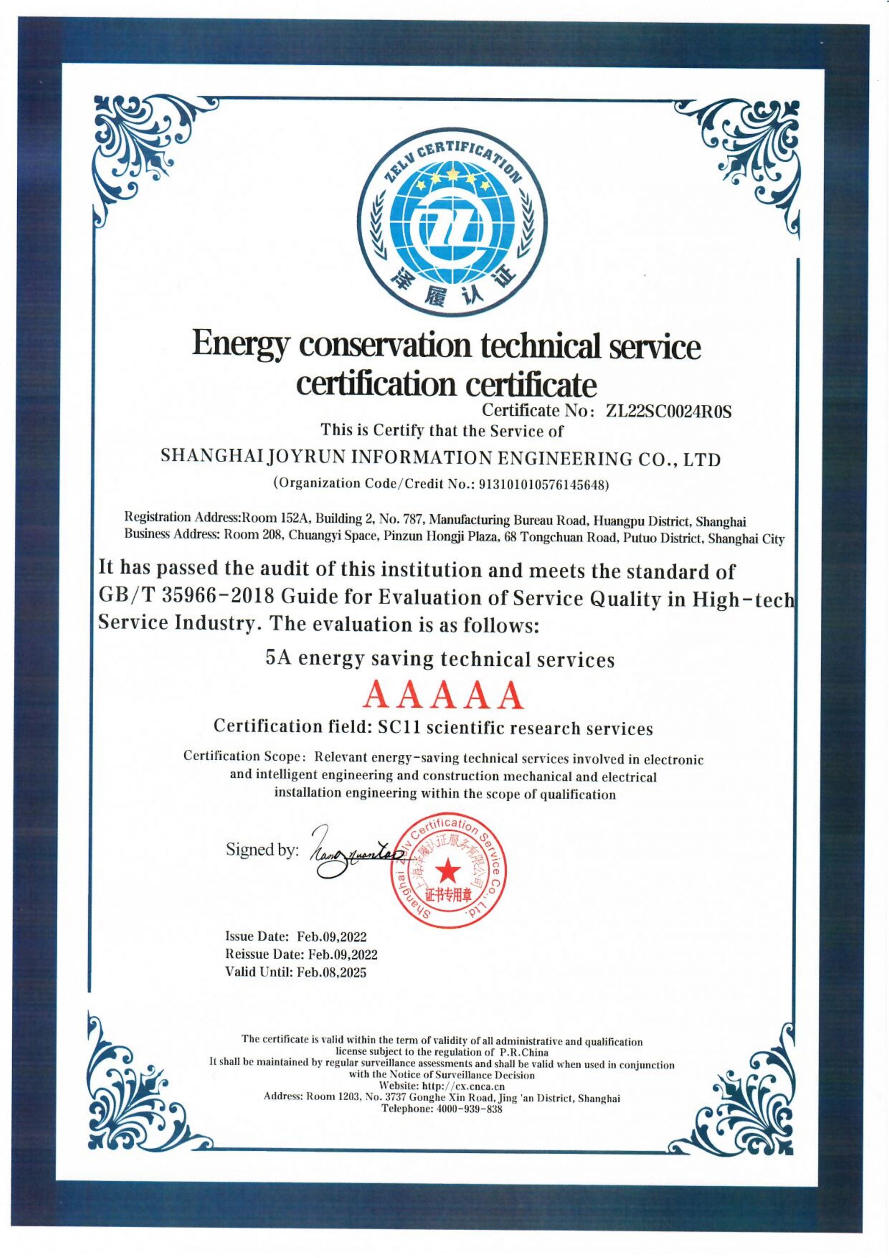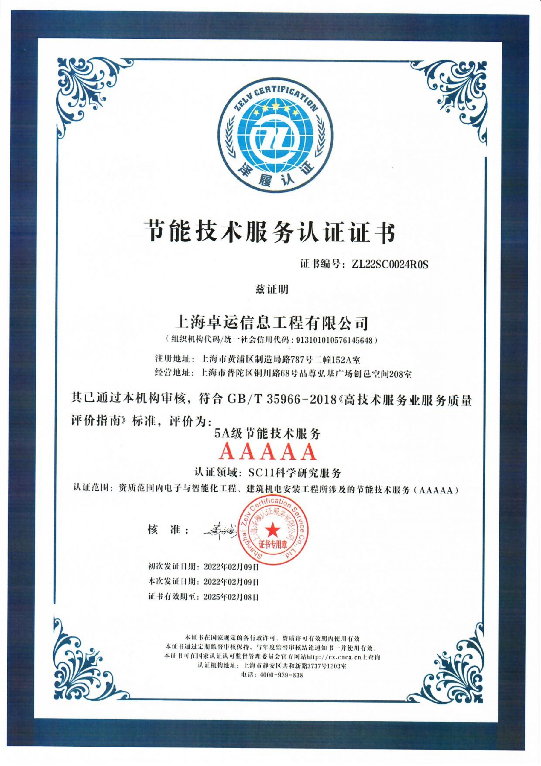 5A级节能技术服务认证证书