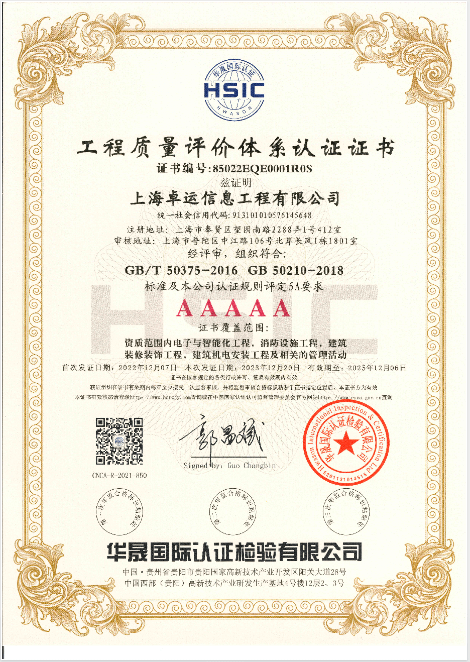 工程质量评价体系认证证书
